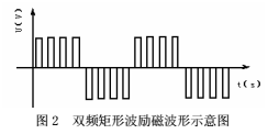 常規電磁流量計所應用的低頻方波勵磁方式的勵磁電流頻率通常為工頻的1/4~1/10。目前深井(6000m以上)的固井施工中所使用泥漿的密度大多在1.8g/cm³以上,流速高達25m/s,所用的泥漿又是固液兩相低導率流體,雖然高壓下能消除非牛頓流體所帶來的測量誤差,但測量管內會產生隨流量增加而頻率增加的隨機干擾噪聲。經測定,在DN50測量管內,所用的泥漿密度為2.0g/cm³,流速在10~15m/s范圍內,測量管內的流動噪聲主要為尖峰狀的泥漿流噪聲,量級在mv級,頻率集中在25Hz以下,如圖1所示。在勵磁頻率較低時,泥漿干擾的數量級較大,高頻時干擾數量級較小,具有1/f的頻譜特性。另外,施工現場敲擊和震動所帶來的低頻噪聲,也會影響電磁流量計的計量精度。提高勵磁電流頻率可以規避和抑止這些干擾,以提高電磁流量傳感器輸出的信噪比,但會犧牲電磁流量計的零點穩定性。本文提出新的一種勵磁方式,采用雙頻矩形波作為勵磁信號。其勵磁電流波形是在低頻矩形波上疊加高頻矩形波,用兩種采樣頻率分別得到高頻和低頻兩種流量信號。如圖2所示,高頻部分是80Hz的矩形波,外包絡線是10Hz的低頻矩形波。這樣,能克服單一低頻矩形波勵磁存在的泥漿流動噪聲,同時又能保證零點的穩定性,提高流量計的計量穩定性和響應速度。