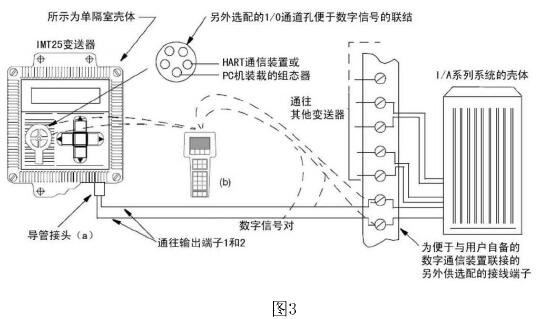 HART通信裝置或裝載在PC機(jī)上的組態(tài)器可以連接在變送器現(xiàn)場接線端到外部負(fù)載之間的任何位置,或連接到另外配供的1/0孔口上。如圖3所示: