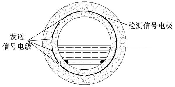 ③利用阻抗或信號衰減研制的非滿管冷卻塔冷卻水流量計。這種結(jié)構(gòu)的非滿管冷卻塔冷卻水流量計是當(dāng)前國內(nèi)研究的方向之一。其結(jié)構(gòu)是流量管底部貼一對信號發(fā)射電極,在流量管中間貼信號接收電極。由于信號在流體中傳播會產(chǎn)生衰減,且傳播時間越長,衰減越多,因此通過信號接收電極接收到的信號衰減量即可得知液面高度;同時該電極還能測量流體切割磁感線產(chǎn)生的電動勢,以此達到測量非滿管流量的目的。阻抗式或信號衰減非滿管冷卻塔冷卻水流量計結(jié)構(gòu)簡圖如圖5所示。