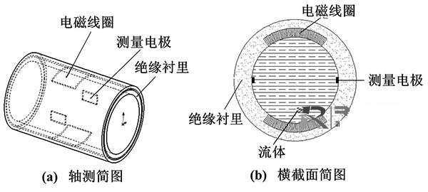電極與被測流體通過絕緣管形成檢測電容,通過此電容來藕合流量信號。其主要的結(jié)構(gòu)形式按照電極的安裝位置可以分為兩種:電極嵌人測量管的絕緣襯里內(nèi)部(嵌人式)、電極貼在測量管外部(外貼式)。嵌入式結(jié)構(gòu)與普通一寸管污水流量計結(jié)構(gòu)相似,而外貼式大多是通過陶瓷表面金屬化技術(shù)將電極貼在測量管外。