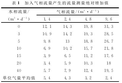 利用清水中渦輪的刻度方程計(jì)算加入不同氣體流量后渦輪響應(yīng)頻率所對(duì)應(yīng)的流量,即為加入氣體后的測量流量,再用所得測量流量減去配比的標(biāo)準(zhǔn)水流量,得到氣相加入后測量的絕對(duì)增加值,即加入氣相流量產(chǎn)生的測量誤差(見表1)。計(jì)算結(jié)果表明,加入氣體流量后,渦輪的測量流量明顯增加,尤其是液相流量較低時(shí),增加的測量流量更高,氣體對(duì)流量測量產(chǎn)生了較大的測量誤差。低氣量下,平均1m3/d的氣量產(chǎn)生的測量誤差大約相當(dāng)于5m3/d(絕對(duì)增加值)。