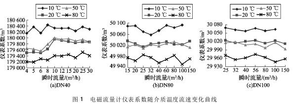 (1) 隨著介質溫度的升高,環(huán)保污水專用流量計的儀表系數均呈逐漸降低的趨勢。其中20℃和50℃的儀表系數基本相同,10℃和80℃的儀表系數與20℃時偏離較大。