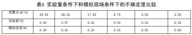 實(shí)驗(yàn)室條件下和模擬現(xiàn)場條件下的不確定度比較(表3)兩次結(jié)果可以看出,兩次實(shí)驗(yàn)各個(gè)流量點(diǎn)的不確定度差距非常大。可見,井水流量計(jì)對(duì)安裝條件還是比較苛刻的。