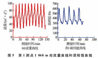 T-××-××1井是大慶油田采油五廠1口水驅產出井,采用阻抗式含水率計在該井進行了測試。圖3、圖4分別為測點深度1097.3m測量的流量及混相值曲線圖。2min的采樣時間內,流量及混相值曲線波動劇烈,明顯受井下產氣影響,進行平均值計算時只能取后半段較平穩(wěn)的數(shù)據(jù),因此,測試時需延長測量時間。錄取不同范圍數(shù)值時流量及含水率測量差值較大,流量平穩(wěn)段為14.81m3/d,高值時達到23.52m3/d;取不同測量段的混相值時測量含水率*大相差12%。重復測量得到了相同的測量結果。由此可見,氣體對流量及含水率測量產生了非常大的測量誤差。
