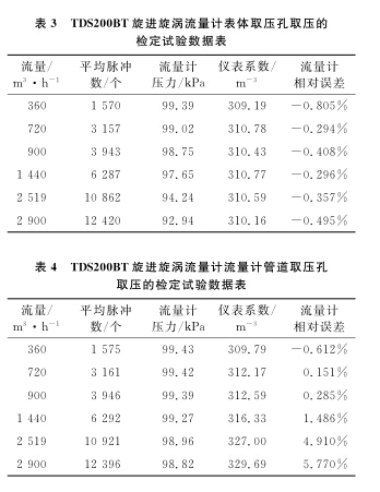 以使用廣泛的DN100B空氣流量計為例,系統運行時間為60s,標準裝置的滯止平均溫度為28.9℃,空間平均濕度為30%,流量計的平均溫度為28.3℃,在表體取壓孔取壓和管道取壓孔取壓的流量計檢定試驗數據分別如表1、2所示。