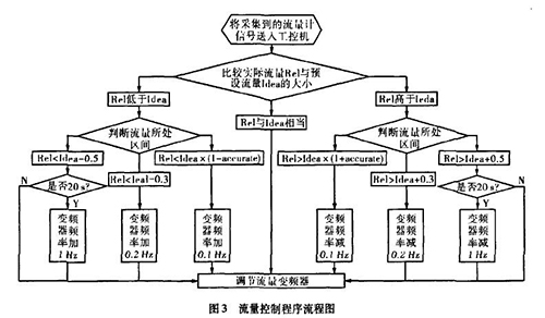 實際生產(chǎn)中流量一直在某個區(qū)域內(nèi)波動,且其動態(tài)特性不易掌握。從上面的理論中我們能夠讓誤差△£盡可能的小,這樣距我們所需要的理論值%就越接近。而減小誤差需要我們把n取的盡可能大,也就是在生產(chǎn)時間內(nèi)劃分更多的周期去調(diào)節(jié)流量。當工控機根據(jù)堿性污水流量計傳送回來的信號發(fā)出調(diào)節(jié)變頻器工作頻率的指令后,電機調(diào)整功率到堿性污水流量計的實際測量為一個工作周期,我們知道從指令發(fā)送到實際測量值返回有一個較大的滯后,如果調(diào)節(jié)的周期時間小于流量計本身的一個工作周期,那么顯然不可能達到減小誤差的目的。利用模糊控制思想H。,在控制程序中我們把流量的波動區(qū)域劃分為±缸×Yo,Yo-t-O.3,Yo±0.5四個區(qū)域,其中缸為可調(diào)節(jié)的誤差范圍,生產(chǎn)中我們?nèi)?.015,流量區(qū)域劃分的單位均為t/h。針對不同的區(qū)域采取不同的調(diào)整方案。具體流程如圖3所示。圖中變量Rel表示實際測量的流量,變量Idea表示理論流量。
