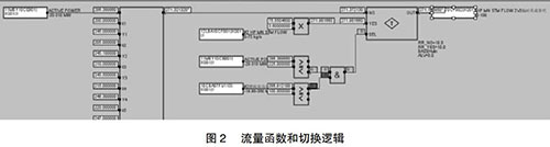 但是由于近期趨勢可能收集不到部分負荷段的相關(guān)數(shù)據(jù),在超出現(xiàn)有數(shù)據(jù)負荷的部分應(yīng)采取必要的補救措施,可以參考相同負荷運行的另一臺余熱鍋爐的主蒸汽流量,以此來彌補現(xiàn)有數(shù)據(jù)的不足。為了保證數(shù)據(jù)切換的可靠性,切換條件要嚴謹,現(xiàn)有函數(shù)的負荷下線上增加25MW與另外一臺的燃機負荷大于100MW。如此設(shè)置的好處是當另一臺運行機組突然故障或跳機時保證數(shù)據(jù)能及時切換到函數(shù)輸出,保證機組的安全運行。具體操作見圖2。