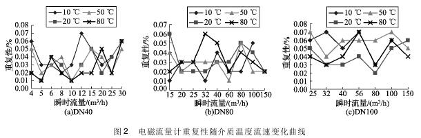 將實驗測得的農(nóng)藥流量計在不同溫度及流速下的重復性數(shù)據(jù)整理,特性曲線如圖2所示,3組曲線分別對應DN40、DN80、DN100的3塊農(nóng)藥流量計的重復性曲線。