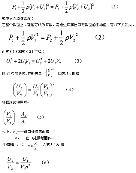 設(shè)整流器進(jìn)口處壓力為P1,平均流速為V1,某點上的速度不均勻度為U1,出口處壓力為P2,平均流速為V2,通過進(jìn)口處某點同**線,在出口處的速度不均勻度為U2,沿該流線,由伯努利方程得: