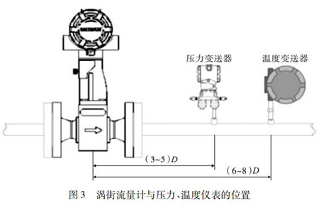 氮氣流量計的口徑如果與工藝管道相同,不能滿足流量儀表要求時,或者在此流速下測量準確度不能保證時,需要縮小儀表口徑,從而提高管內流速,保證測量精度。上下游必須有足夠的直管段,若傳感器安裝點的上游在同一平面上有 2 個 90°彎頭時,上游直管段≥25D,下游直管段≥5D。根據測量的需要,需在氮氣流量計附近測量壓力和溫度時,測壓點應在傳感器下游的( 3 ~ 5) D 處,測溫點應在傳感器下游的( 6 ~ 8) D 處,如圖 3 所示。