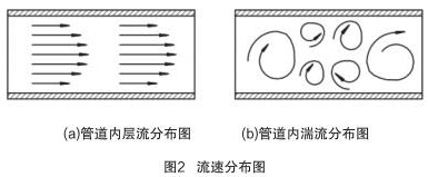 當 Re > Rec 時,管道內(nèi)流體為湍流(湍流是流體的不規(guī)則運動,流場中各種量**間和空間坐標發(fā)生紊亂地變化),如圖 2(b)所示。