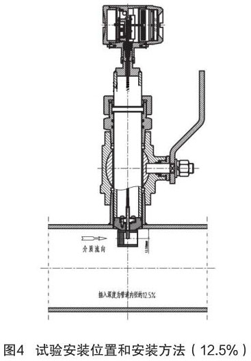 根據(jù)中華人民共和國機械行業(yè)標準:JB/T9249-2015《煙氣流量計》進行插入式煙氣流量計的研制與設(shè)計。在試驗過程中,因為理論研究不充分,再加上經(jīng)驗不足,采用插入深度是按照以往其它產(chǎn)品(插入式電磁流量計)的經(jīng)驗,以插入深度為現(xiàn)場管道內(nèi)徑的 12.5% 進行試驗,其對介質(zhì)流量的檢測值與同種規(guī)格管道法蘭式結(jié)構(gòu)的煙氣流量計進行比較,偏差值較大、儀表準確度無法滿足設(shè)計要求。試驗安裝位置和安裝方法如圖 4 所示。