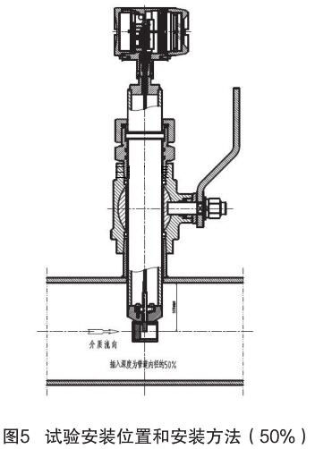 對插入式煙氣流量計和插入式電磁流量計的結(jié)構(gòu)原理進行分析,插入式電磁流量計的信號采集點在標校管道內(nèi)12.5% 為宜,因它屬電磁類流量計,而煙氣流量計是根據(jù)“卡門渦街”原理進行測量管道內(nèi)流量,根據(jù)標校管道內(nèi)層流和湍流的分析,以及插入式煙氣流量計獨特的探頭結(jié)構(gòu)形式,確定插入式煙氣流量計的插入深度為標校管道內(nèi) 50%,試驗安裝位置和安裝方法如圖 5 所示。