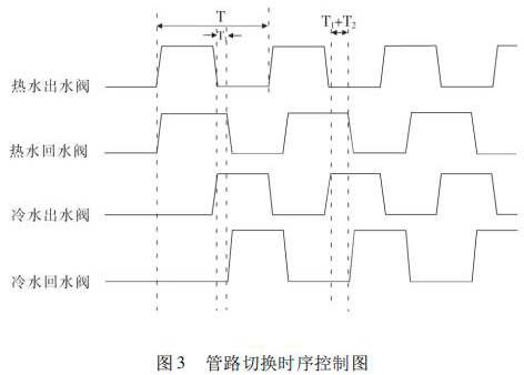 開(kāi)始試驗(yàn),冷熱水箱預(yù)先達(dá)到試驗(yàn)要求溫度,水泵運(yùn)轉(zhuǎn)調(diào)節(jié)管路流量至設(shè)定值。系統(tǒng)給定信號(hào)控制四個(gè)開(kāi)關(guān)閥(熱水出水閥、熱水回水閥、冷水出水閥、冷水回水閥) 的打開(kāi)與關(guān)閉,實(shí)現(xiàn)冷熱水的切換。熱水沖擊時(shí),熱水出水閥與熱水回水閥打開(kāi)的同時(shí),冷水出水閥與冷水回水閥關(guān)閉,確保試驗(yàn)管路熱水沖擊;同理,冷水沖擊時(shí),冷水出水閥與冷水回水閥打開(kāi),熱水出水閥與熱水回水閥關(guān)閉,確保試驗(yàn)管路冷水沖擊。系統(tǒng)通過(guò)四個(gè)開(kāi)關(guān)閥對(duì)管路進(jìn)行時(shí)序控制,達(dá)到管路切換的目的,很好地實(shí)現(xiàn)了 4000次冷熱循環(huán)沖擊試驗(yàn)。其具體的管路切換控制時(shí)序圖如圖 3 所示。