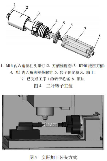 目前量產中的轉子都是型材毛坯,采用成型砂輪磨削或者定制成型銑刀進行加工轉子曲面。這種加工方式工藝成熟,適合大批量生產,而且有利于轉子線型的技術保密,但加工方式在研發試制中應用試制加工周期會很長,而且成本很高,不適合單件或小批量試制。為此,筆者基于四軸立式加工中心,結合三葉轉子加工工藝提出一種工裝,如圖 4所示。將這套工裝定位在立式加工中心四軸回轉中心上,加工裝夾方式如圖 5 所示。用機床尾軸頂住轉子來增強加工剛性避免切削時產生震顫。