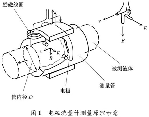 智能型防腐電磁流量計的測量原理如圖 1 所示。根據法拉*電磁感應定律,導電液體在磁場中流動會產生電動勢 E,它與磁感應強度 B、導電液體平均流速 v 成一定比例關系: