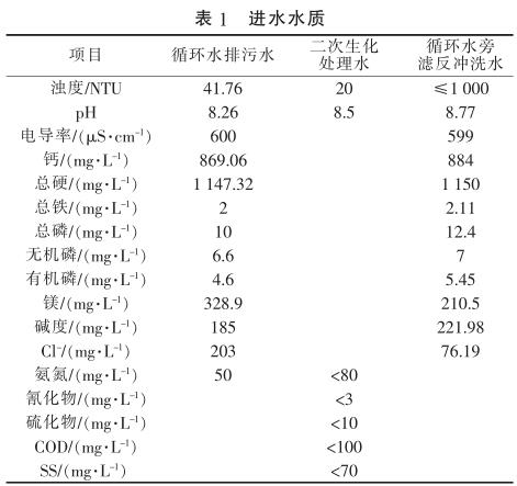 由表1可知,循環(huán)水排污水濁度較高,硬度大,主要是鈣鹽、鎂鹽含量較高;二次生化處理水是經現(xiàn)有的生化處理系統(tǒng)處理后的氣化灰水、沖渣水等廢水,其氨氮、COD需進一步去除,以利于后續(xù)脫鹽處理系統(tǒng)的運行。