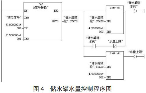 (2)程序設(shè)計。儲水罐水量控制的工作過程為:當壓力變送器檢測到儲水罐的水量低于 450kg 時,補水閥 3 開啟為儲水罐補水;當水量達到 490kg 時,補水閥 3 關(guān)閉;生產(chǎn)配制過程中,循環(huán)以上控制過程。儲水罐水量控制的程序如圖 4 所示。