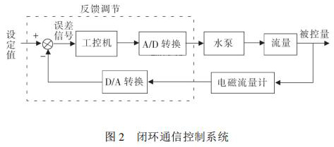 通信控制系統由工控機、變頻器、水泵、數據采集卡、煤油流量計等組成。在整個熱量表耐久性試驗裝置中,煤油流量計與被試驗熱量表串聯在試驗管路中。系統設定流量值 qs,通過工控機發送信號給變頻器,來控制水泵運轉,系統通過研華數據采集卡 PCI1711 將采集到的煤油流量計當前瞬時流量值反饋給工控機,工控機將返回流量值與設定流量值qs進行比較,從而確定是否需要重新調整變頻器頻率控制水泵轉速。此過程是一個完整的閉環 PID 控制過程,其閉環控制過程如圖 2 所示。 2. 2 管路切換系統管路切換主要由冷熱水箱、水泵、開關閥等組成。要實現熱量表耐久性 4000 次冷熱沖擊試驗,需要實時控制管路中熱水與冷水的交替使用。
