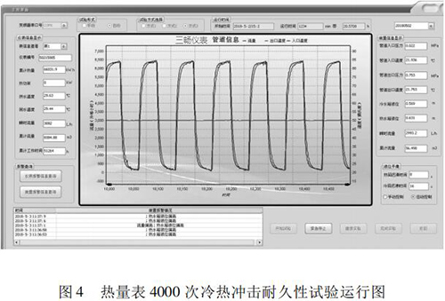 本文研究的 4000 次冷熱沖擊試驗的實現具有以下特點: (1)基于“工控機 +水泵 + 煤油流量計”的閉環控制系統,實現了流量自動反饋調節,滿足試驗要求; (2)通過四個開關閥的時序切換,自動控制試驗溫度,很好的完成了 4000 次溫度沖擊試驗; (3)通過“工控機 + 數據數據采集卡”的數據采集系統,實時監控試驗過程中的流量、溫度、壓力等相關參數,實現試驗方式的自動控制,并能對試驗數據進行分析與評定。 (4)試驗的全過程為智能自動化,可無人員留守看護。試驗結果可直接反映出熱量表在長時間運行后的可靠性。為我國熱量表耐久性試驗研究提供檢測手段,為促進產品質量提升做好技術保障。