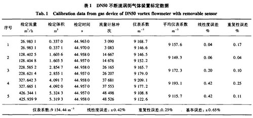 在實際標定過程中,相同口徑的不斷流渦街與普通氣體渦街流量計在可測流量范圍、基本誤差、重復性等參數上基本一致,達到了設計和使用精度的要求。