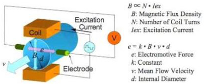 基本上,當(dāng)導(dǎo)電液體流過(guò)磁場(chǎng)時(shí),會(huì)感應(yīng)出電壓。為了測(cè)量該產(chǎn)生的電壓(與流動(dòng)的液體的速度成正比),使用了兩個(gè)彼此相對(duì)安裝的不銹鋼電極。
