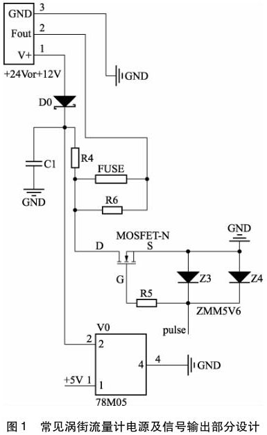 從圖1 中可以看到,供電電源 +24 V, +12 V均可,直流電源通過瓷片電容 C1 濾掉部分紋波,然后通過線性穩(wěn)壓芯片 78M05,得到 + 5 V 電壓,為后面的渦街蒸汽流量計信號處理電路供電,若要再得到 3. 3 V 電壓,通常會在 78M05 后再加一片線性穩(wěn)壓芯片 LM1117-3. 3,為了節(jié)約成本,供電電路沒有做 EMS 設計。同時,脈沖輸出部分,僅通過一個 MOS 管和兩個穩(wěn)壓管,也沒有 EMS 方面的設計考慮。