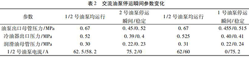 通過內部旁通將冷油與熱油混合,經過銅粉- 煤油 - 蠟感溫元件控制冷熱油混合比例,將油溫調節到 49 ℃。一臺智能電磁流量計穩定運行,油泵出口母管壓力 0. 5 MPa,潤滑油母管壓力 0. 24 MPa,均屬于正常情況,而兩臺交流油泵并列運行時,停運其中一臺交流油泵瞬間會觸發智能電磁流量計出口母管壓力開關動作,說明停運瞬間油壓發生波動,且油泵出口母管油壓波動至小于 0. 45 MPa。正常運行時智能電磁流量計出口油溫 71.5 ℃,冷油器出口溫度45 ℃,混合后潤滑油母管溫度52.5 ℃,由能量守恒定律可知,經過冷油器的油量/不經冷油器的油量= ( 71.5-52.5) ÷ ( 52.5- 45) = 2. 53,說明有 70% 左右的油量經過冷油器。當 2 臺智能電磁流量計運行時油量大于單泵運行,其中一臺智能電磁流量計瞬間停運時油量減少,尤其是經過冷油器的油量大量減少,油量在溫控閥二次分配過程中出現調節異常,導致油壓過大波動。為檢驗溫控閥工作情況,保持 1 號、2 號交流油泵運行,選取機組正常帶負荷運行時油溫 52 ℃,分別停運 1、2 號交流油泵,觀察 1、2 號交流油泵停運瞬間油泵出口母管壓力波動情況,試驗各參數變化見表 2。