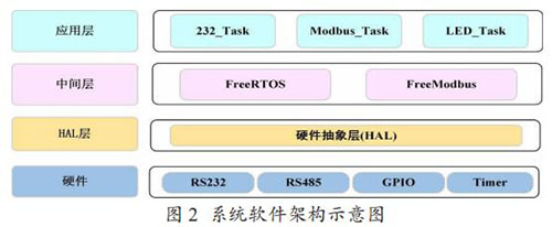 Modbus 通訊模塊的軟件架構(gòu)如圖 2 所示,分為硬件層、硬件抽象層,中間層和應(yīng)用層。中間層包括一個(gè)實(shí)時(shí)操作系統(tǒng)FreeRTOS 和一個(gè)針對(duì)嵌入式環(huán)境開發(fā)的輕量級(jí) Modbus 協(xié)議庫(kù)Freemodbus。在應(yīng)用層,主要?jiǎng)?chuàng)建了三個(gè)任務(wù),232_Task 負(fù)責(zé)讀 取和解析流量計(jì)表頭輸出的文本信息,Modbus_Task 負(fù)責(zé)存儲(chǔ) 解析后的流量計(jì)數(shù)據(jù)到 Modbus 寄存器表,以及以 Modbus 協(xié)議與取水監(jiān)測(cè)設(shè)備通信,LED_Task 是一個(gè)輔助任務(wù),主要用來提示程序運(yùn)行狀態(tài)。