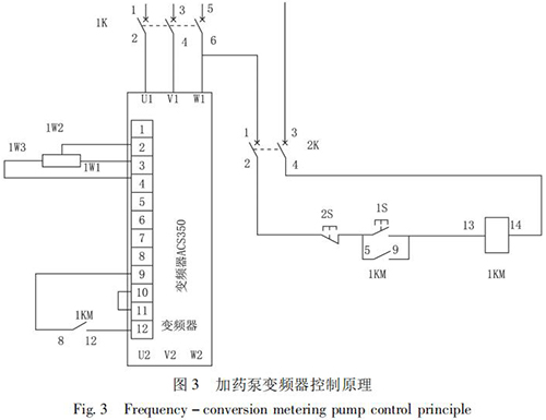STD - Ⅲ型浮選工藝參數自動測控系統通過雙膜盒差壓計測量原礦漿濃度; 采用管道式流量計測量原礦漿流量,由 PLC 計算出入浮干煤泥量和藥劑的瞬時添加量,用變頻式計量泵完成浮選藥劑的添加。通過上位機還可以打印小時、班、天及月的運行數據,更加有利于生產管理及技術分析,藥劑自動原理如圖 2 所示,k1、k2、k3 是計算修正參數。以 PID 算法為核心,通過優化控制程序計算出藥劑給定量,在捕收劑和起泡劑管道上分別安裝藥劑測量裝置,用于檢測藥劑的添加量。當藥劑測量值小于藥劑給定量時,PID 輸出增大,反之則減小。加藥泵變頻器控制原理如圖 3 所示。