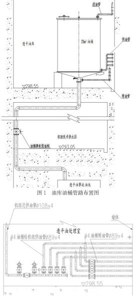 透平油油庫及油處理室設(shè)置在發(fā)電機出線層。油庫中安裝4個油桶,單個油桶容積為25m3。按照功能劃分為2個運行油桶,2個凈油桶。每個油桶ding部設(shè)置一根油桶進油管,油桶下部設(shè)置一根給機組供油管,油桶底部設(shè)置一根事故排油管,經(jīng)事故排油閥引入事故油池中,事故排油管上引出一根油桶排油管。各油桶的進油管、供油管、排油管分別引入油處理室中。具體布置形式可見圖1所示。油處理室中設(shè)置一個容積為1m3的移動油箱,用于向設(shè)備添油或臨時儲油。