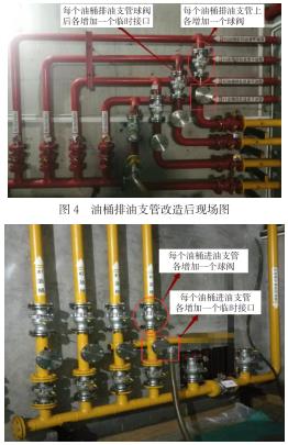 (1)改造后,各個油桶的油處理工作實現(xiàn)互不影響的效果。油桶排油支管的臨時接口兩端的球閥都是近油桶側(cè)的閥門,油桶進油支管的臨時接口ding部的球閥為近油桶側(cè)的閥門。油桶需進行油過濾工作時,僅需將濾油機的進油管接在該油桶排油支管新增的臨時接口上,同時濾油機的出油管連接在該油桶進油支管新增的臨時接口上,然后分別打開進油支管和排油支管新增臨時接口ding部的近油桶側(cè)球閥,即可開始形成循環(huán)油路進行油桶內(nèi)的透平油過濾。同時未改變各個油桶中透平油的互相倒換、轉(zhuǎn)移功能。