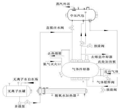 來(lái)自無(wú)離子水罐的脫氧水經(jīng)多經(jīng)泵加壓、經(jīng)脫氧水加熱器加熱后進(jìn)入到液體渦街流量計(jì)的水段,脫氧水與反應(yīng)氣體換熱后分兩路:一路進(jìn)入中壓汽包,保證汽包有穩(wěn)定的液位;一路進(jìn)入熔鹽冷卻器帶出熔鹽攜帶的反應(yīng)熱。來(lái)自中壓汽包的高溫水經(jīng)管路接至液體渦街流量計(jì)汽段底部,高溫水與反應(yīng)氣體換熱后產(chǎn)生高壓蒸汽,高壓蒸汽又返回中壓汽包。汽包還有一路直接注水管路,此路水不經(jīng)過(guò)液體渦街流量計(jì)水段,而是直接進(jìn)入汽包。在液體渦街流量計(jì)出口溫度偏低而汽包液位也比較低時(shí),可開(kāi)此直接注水管路來(lái)穩(wěn)定汽包液位。其詳細(xì)流程圖如圖 2。