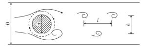 渦街氣體流量計是由漩渦發(fā)生體、頻率檢測器和信號轉(zhuǎn)換器等環(huán)節(jié)組成,輸出 4 ~ 20 mADC 信號或脈沖電壓信號。其測量原理是在流動的流體中的垂直流動方向安放 1 根或多根非流體型阻流體,在一定的流量范圍內(nèi),流體在阻流體兩側(cè)交替地分離、釋放出 2 串頻率正比于管道內(nèi)的平均流速、規(guī)則的、不對稱有規(guī)律的交替漩渦列,如圖 1 所示,且兩側(cè)漩渦旋轉(zhuǎn)方向相反 。采用檢測元件測出漩渦頻率就可以推算出流體的流量。