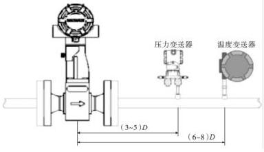 渦街氣體流量計的口徑如果與工藝管道相同,不能滿足流量儀表要求時,或者在此流速下測量準確度不能保證時,需要縮小儀表口徑,從而提高管內(nèi)流速,保證測量精度。上下游必須有足夠的直管段,若傳感器安裝點的上游在同一平面上有 2 個 90°彎頭時,上游直管段≥25D,下游直管段≥5D。根據(jù)測量的需要,需在渦街氣體流量計附近測量壓力和溫度時,測壓點應(yīng)在傳感器下游的(3 ~5)D 處,測溫點應(yīng)在傳感器下游的(6 ~8)D 處,如圖 3 所示。
