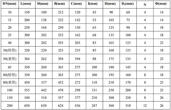 *DN10/DN50(輕型)/DN65/DN80(輕型)法蘭尺寸為 1.6MPa 標準;其余口徑為 6.4MPa 標準;