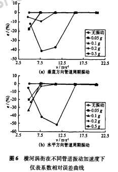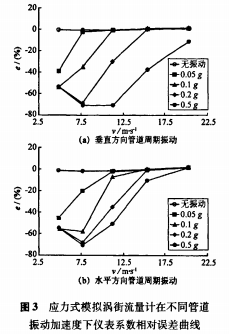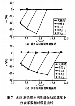以應力式模擬渦街流量計為被測對象,在5m/s、7.5m/s、11m/s、15.5m/s、20.5m/s流速下,分別進行了無振動和施加管道周期振動的實流標定試驗。管道振動方向為垂直方向和水平方向,加速度為0.05-0.5g。根據試驗數據,繪制出不同管道振動加速度下渦街儀表系數相對于無管道振動時平均儀表系數的相對誤差曲線,垂直方向結果如圖3(a)所示。