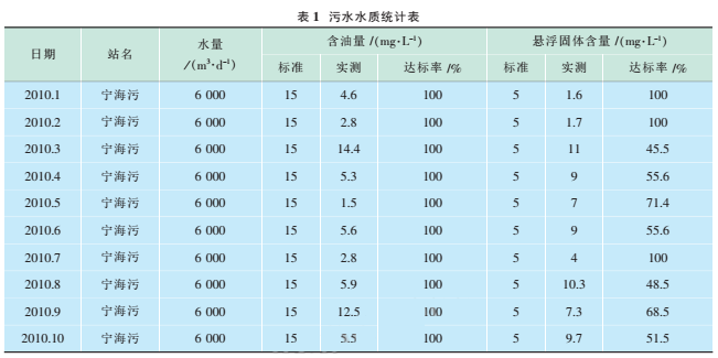 以一礦為例,2010年1~10月寧海污水站累計處理污水187萬m,日均6200m。,110月份外輸污水含油累計達標率100%,外輸懸浮物累計達標率69.7%(見表1)。